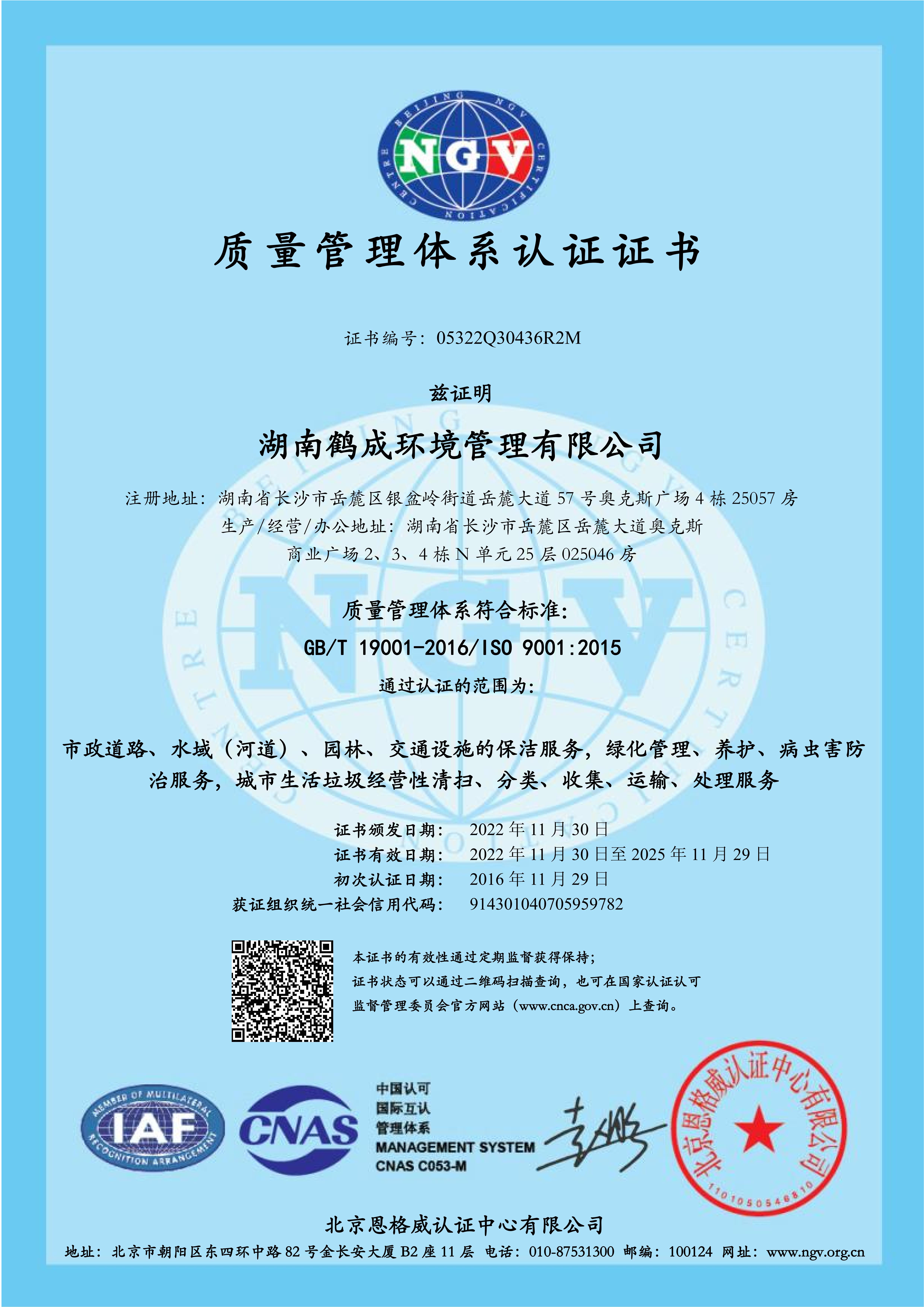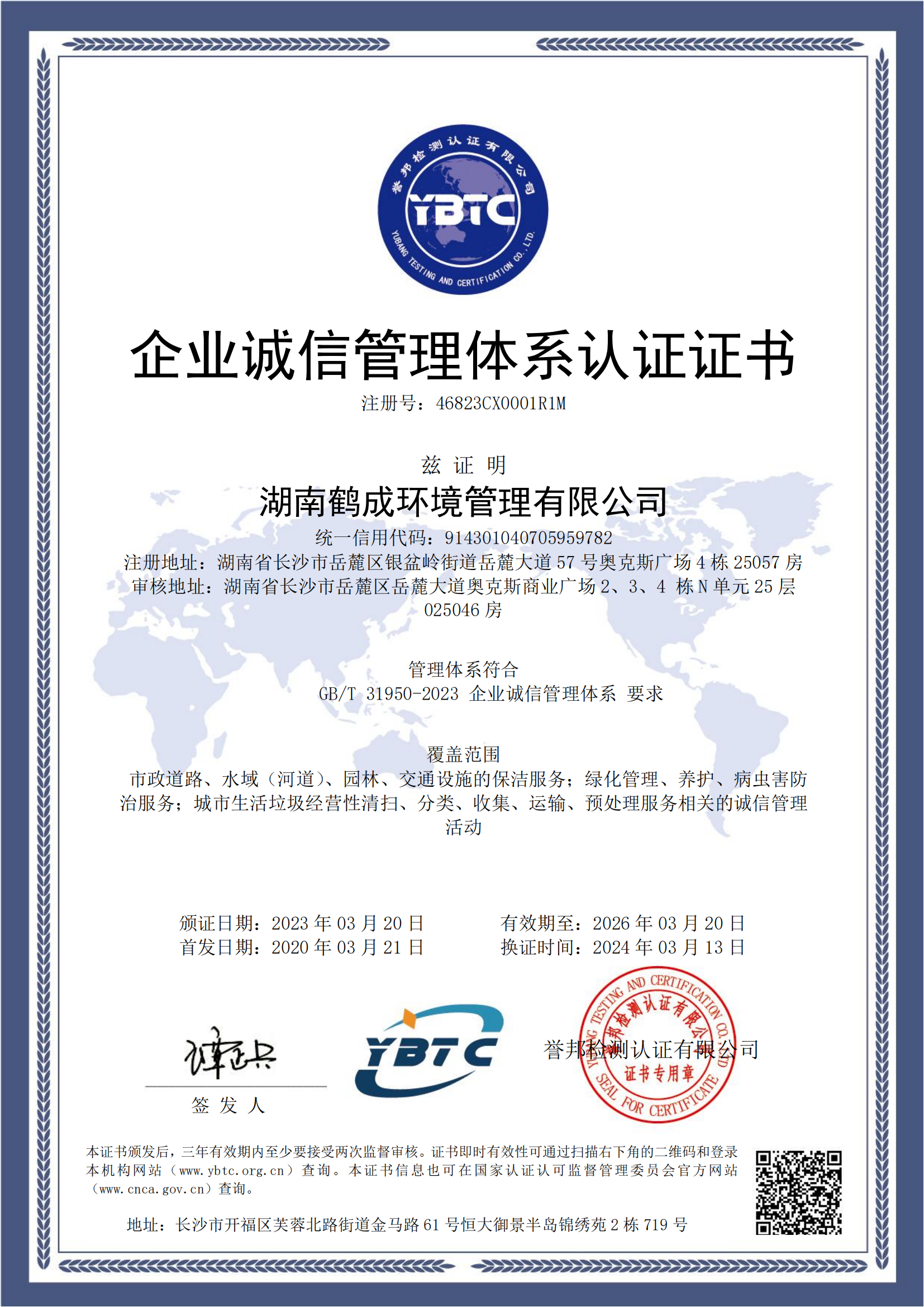 湖南鹤成环境理有限公司,成立2013q?月,原名长沙鹤成景观实业发展有限公司Q经q近几年的飞速发?各方资金的引?加之各界C会(x)力量的大力支?我司已发展成Z家实力雄厚的专业城乡环境化一体化q营商?br/>       目前公司总部自有办公面积500多^方米,座落在湖南省长沙市岳麓区奥克斯广场,现有员工3000余hQ其中管理h?26人,技术h?5人,公司配备行业优质的清z机械设备,现有多功能机扫R、大型洗扫R、自卸式垃圾清运车、高压清zR、高压水车、垃?qx)车、压~垃圾R、高温高压洗地机、新能源车、E查R{?00余辆。ؓ(f)方便理公司环卫车辆、优化出行\Uѝ高效指导环卫工作,公司搭徏了鹤成环境智慧环卫管理云q_Q对我司车辆q行数字化、专业化、精l化理。公怸要经营市攉K路清z维护、物业清z维护、园林绿化工E服务、风景园林工E设计与施工、交通设施的清洗l护、城市生zd?攉q输、绿化管理等服务目?br/>